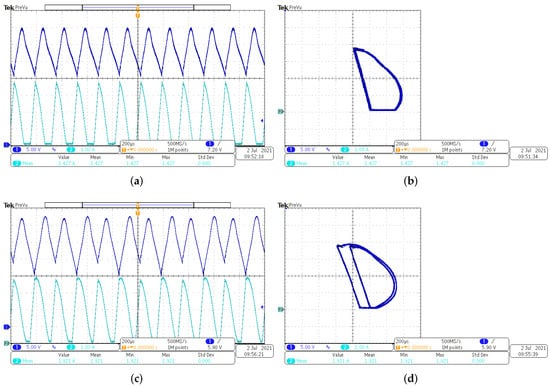 Figure 4 shows the time domain waveforms and the state plane trajectories for two different values of the power. For W, the system behavior was stable and periodic with the same period as the driving signal (Figure 4a,b). For W, the converter exhibited subharmonic oscillation due to a period-doubling bifurcation (Figure 4c,d).