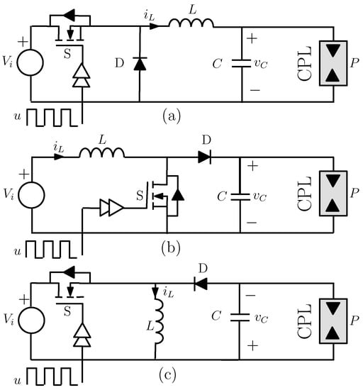 Elementary switching converters loaded by a CPL: (a) buck, (b) boost, and (c) buck–boost.