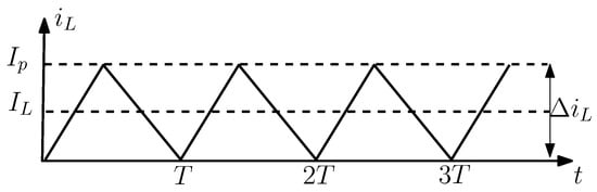 As in the resistive load case, the boundary between the CCM and DCM operation can be derived in terms of the switching period T, inductance value L, duty cycle D, and input voltage . In the case of the CPL, the boundary also depends on the constant power P. The analysis reported in [] (Chap. 5) was here adapted for the case of a CPL. In the boundary between CCM and DCM, the inductor current of any elementary converter behaves in steady-state, as illustrated in Figure 6. Roughly speaking, the operation in DCM will eventually take place if either the ripple is increased or the average inductor current is decreased. The expression of is given in Table 3 for the three elementary converters. At the boundary of CCM–DCM, one has .