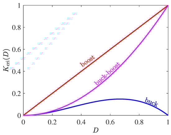 It is worth noting that, for the buck converter, the maximum value of is . This maximum value occurs for . Therefore, for this converter, the DCM operation will not take place for no value of D if . For the boost and the buck–boost converter, there will always exist an interval of the operating duty cycle D within which the DCM operation will theoretically take place if . This interval becomes wider if the value of the dimensionless parameter K decreases.