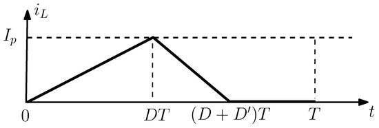 Under certain conditions, the dynamics of a DCM-operated converter can be accurately described by an averaged model. Let us assume that the capacitor voltage ripple is sufficiently small during a switching cycle such that time dependence of the inductor current can be considered linear: goes from 0 to a certain peak value during the time interval (that for ); after that, drops to 0 during the time interval and remains 0 during the rest of the period with duration (Figure 8).