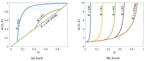 Under the existence conditions, the voltage conversion gain for the DCM-operated buck and the boost converters with a CPL are given in Table 4. These conversion ratios are plotted in Figure 9 in terms of the duty cycle D for different values of K. It is worth noting that, at the boundary between CCM and DCM, the conversion ratios become the widely known load-independent voltage gains and for the buck and the boost converters, respectively.