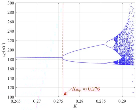 To reveal the possible dynamical behaviors that can exhibit a DCM-operated boost converter with a CPL, a bifurcation diagram was computed using the exact switched model of the converter implemented in the PSIM© software. The result is represented in Figure 10. The used fixed parameter values are depicted in Table 5. The parameter P was taken as a bifurcation parameter, which varied in the range kW. The sampled values of the capacitor voltage are plotted versus the dimensionless parameter K. Clearly, it can be observed that, from an initial fundamental (one-periodic) orbit, a cascade of period-doubling bifurcations culminates in a chaotic regime. First, a stable two-periodic orbit is generated at a critical value of the power P, W, or equivalently, the dimensionless parameter K, , and further variations of the bifurcation parameter P or equivalently K make this emerging orbit also unstable, and so on, finally producing chaotic dynamics. This phenomenon is the celebrated period-doubling bifurcation route to chaos encountered in many mathematical and physical systems. By increasing the bifurcation parameter P a bit further, a non-admissible dynamics, both from a mathematical and a practical point of view due to an unlimited CPL current, comes out. Indeed, the increasing size (interval for ) of the chaotic attractor due to further variation in the parameter produces the mentioned very high current in the load, and so, the dynamics makes no sense. A numerical integration, for instance with commercial software, would give incoherent results similar to the ones mentioned in Remark 1. The upper value of the bifurcation parameter was selected smaller than the one corresponding to any voltage collapse.