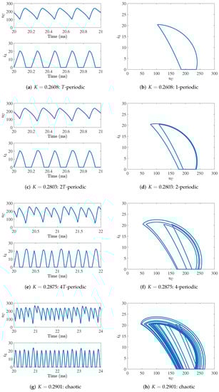 Representative time domain waveforms and state trajectories are represented in Figure 11. They were obtained using the same fixed parameters as in Figure 10 for different values of the dimensionless parameter K or, equivalently, power P. In this figure, orbits of different periodicity can be observed. The case of Figure 11a,b corresponds to a fundamental DCM one-periodic orbit. Figure 11c,d stand for the subharmonic oscillation with a periodicity of two produced; after that, the fundamental one-orbit loses its stability by a conventional smooth period-doubling bifurcation. The resulting DCM two-periodic orbit evolves such that it undergoes a period-doubling resulting in the DCM four-periodic orbit represented in Figure 11e,f. Finally, Figure 11g,h represent a DCM chaotic attractor.