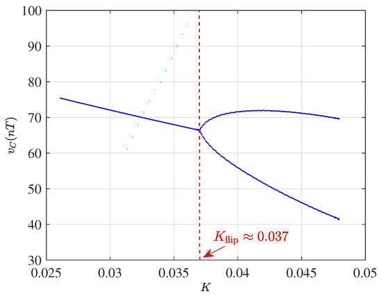 Accordingly, the corresponding maximum value of power P can be obtained from (17) and the expression of K in terms of P defined previously. For the parameter values considered in this study, the critical value of the dimensionless parameter K at the flip bifurcation point is , and from this, the critical value of the power P is W, in remarkable agreement with the bifurcation diagrams represented in Figure 10 and Figure 13a. In terms of the output capacitance, the closed-form expression obtained from (17) with is simpler and can be written as follows: