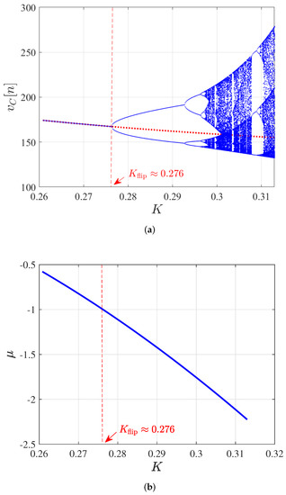 The behavior of the converter around a fixed point generally depends on whether the absolute value of the characteristic multiplier is greater or smaller than one. If it is smaller than one, the fixed point is an attractor, and if it is greater than one, it is a repellor. When crosses as a parameter is varied, this possibly indicates a period-doubling bifurcation. In Figure 13b, the characteristic multiplier is plotted in terms of the bifurcation parameter. Observe that, at the first period-doubling bifurcation point, one has .