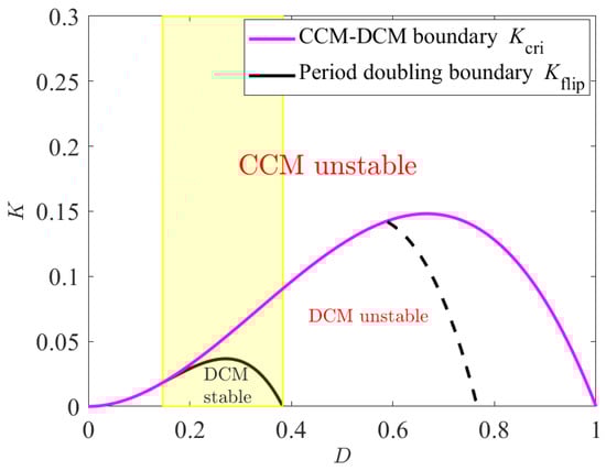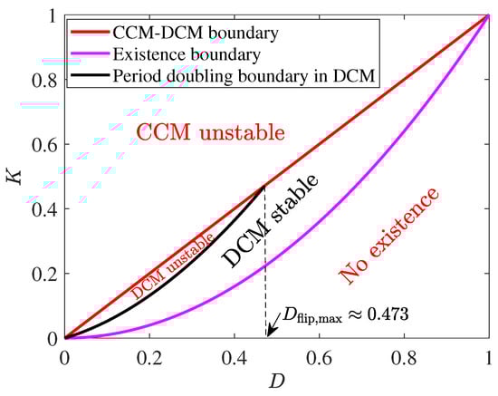 Note that a maximum value of the duty cycle D exists, above which period-doubling bifurcation cannot take place, since, in this case, and the converter will operate in CCM. The expression of can be obtained in closed-form by solving the equation . Taking into account that (see Table 3 for the boost converter), the following expression for from (15), with , is obtained: