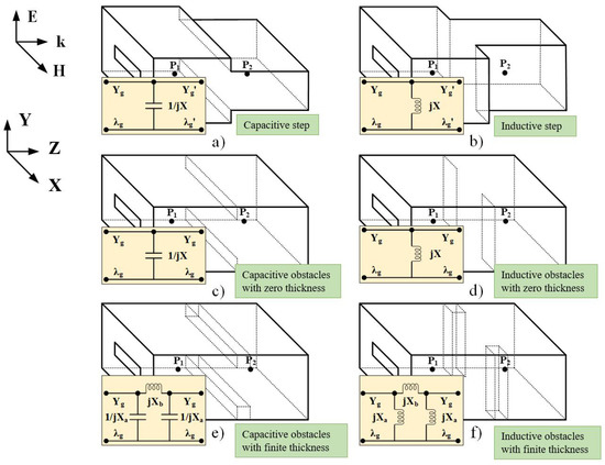Six common types of irregular structures. (a) Capacitive step, (b) Inductive step, (c) Capacitive obstacles with zero thickness, (d) Inductive obstacles with zero thickness, (e) Capacitive obstacles with finite thickness, (f) Inductive obstacles with finite thickness.