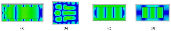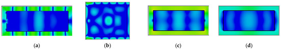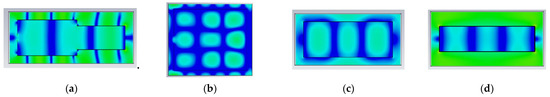 Mode303 field distribution of capacitive obstacles with a zero thickness value. (a) x section, (b) y section, (c) z section of the front part, and (d) z section of the back part.