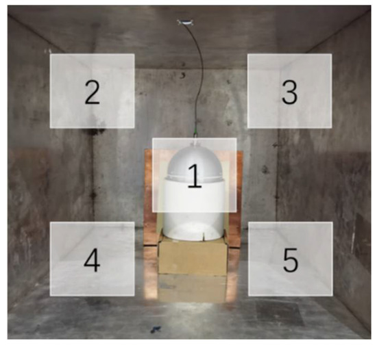 In the frequency band from 20 MHz to 1 GHz, the laboratory’s self-developed receiving spherical dual antenna is used for the shielding effectiveness test of the irregular cavity. The plan for the test is given based on the shielding effectiveness characterization and selecting the location and number of observation points, as shown in Figure 12 and Figure 13. The transmitting antenna is the biconical antenna (20 MHz~100 MHz) or logarithmic period antenna (100 MHz~1 GHz).