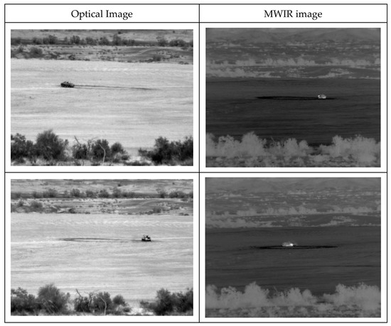 We used the ATR dataset [32], provided by the Defense Systems Information Analysis Center (DSIAC), to validate our method for visible-to-MWIR image translation. In this dataset, there are visible and MWIR videos of different vehicles taken at long distances. We extracted frames from the visible and MWIR videos to train our model. During training, 3600 frames from each domain were used to train our model. We extracted 1875 frames from the visible domain to test the trained model. The frame size of MWIR videos is 640 × 512, and the frame size of optical videos is 640 × 480. Figure 2 shows two training samples from both domains.