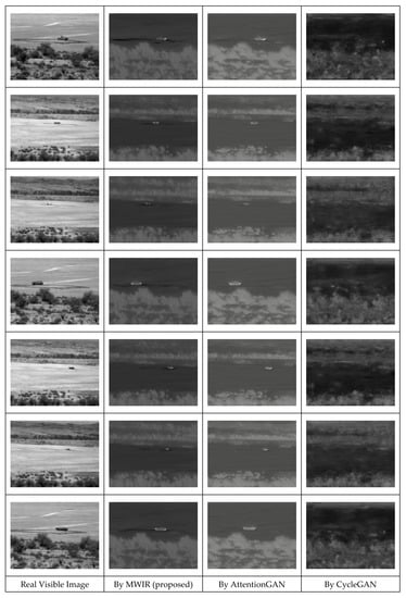 MWIR images generated from visible images by different models. The proposed model generated best-quality MWIR images. MWIR images generated by the AttentionGAN have visible stripe artifacts. The vehicle objects are not visible in the MWIR images generated by the CycleGAN.