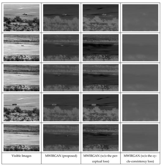 We conducted an ablation study to investigate the contribution of each of the loss function components in the proposed model. Figure 4 shows the results of the ablation study. First, we removed the perceptual loss from the overall loss function and kept the cycle-consistency loss and GAN loss. With this configuration, we noticed that the model experienced mode collapsed due to the absence of perceptual loss and could not translate objects in the visible domain to the MWIR domain. For visible images captured at the 1000 m distance, the model could not highlight vehicles properly (such as the engine part), and for the 2000 m distance images, the model totally omitted vehicles that were missed in the translated MWIR images. Second, we removed the cycle-consistency loss from the total loss and performed image translation with the modified model. This configuration achieved the worst result as it could not translate the visible image into the MWIR domain, keeping all objects intact. Table 2 shows the quantitative results of the ablation study. We can see that both loss function components are important, and the proposed model did not function properly without either of them.