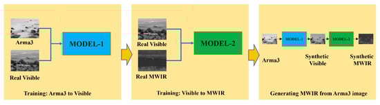 Illustration of the proposed two-step technique for generating MWIR images from game-engine-generated images.