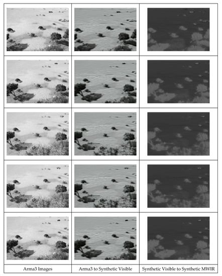 As a case study, we applied the proposed model to convert synthetic visible images from Arma 3 [37], generated by the Real Virtuality 4 engine [37], to MWIR images. This was a two-step process. First, we trained the proposed model to convert the game-engine-generated synthetic visible images to real visible images. We utilized 3600 unpaired game-engine-generated images and 3600 real visible images to train the model. Second, we applied our original trained model to convert the converted real visible images to MWIR images. Figure 5 shows the diagram of the two-step method for converting game-engine-generated images to MWIR images. Figure 6 shows the results of the proposed model. It is observed that our proposed technique could generate MWIR images from Arma-3-generated images. In the generated MWIR images, vehicles were correctly highlighted with engine parts being brighter than other objects. The quantitative results of the generated MWIR images from the game engine images are listed in Table 3. We also compared the generated MWIR images with those generated from real visible images. According to the quantitative results, the quality of synthetic MWIR images from Arma 3 (using our model) was better (FID: 2.72, KID: 41.84) than the MWIR image from the real visible image (FID: 3.28, KID: 49.69) generated by CycleGAN. As expected, the quality of the synthetic MWIR images from the Arma 3 images (FID: 2.72, KID: 41.84) was worse than that of the synthetic MWIR images from the real visible images (FID: 1.72, KID: 22.82).