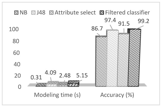 The results for the binary classification in Table 5 show superior results in terms of accuracy for the J48 classifier (97.4%) and the filtered classifier (99.2%). In comparison, the lowest accuracy was obtained from the naïve Bayes algorithm (86.7%). We also noticed that the filtered classifier consumed more time (5.15 s) in the modeling than the J48 classifier (4.09 s).