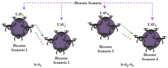 Figure 1 shows the disaster monitoring scenario based on UAVs. In the swarm, each particle shares its local attractions with another particle. The global best term of the equation is the best in the whole search area. This paper describes a different approach to the algorithm suggested in this document due to UAVs’ contact restrictions. Accordingly, the method in which is established as the swarm topology for particles is used. In our case, is the UAV community that shares its own local best knowledge with . The UAV group that belongs to topology produces the best UAV at time . For this particular category of UAVs which belong to the topology , this best neighbor is the global best solution. In our situation, the global best is not special; however, it is the best of many neighbors.