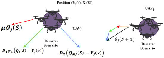 Figure 3 illustrates the disaster position analysis. The SOA algorithm sees any UAV of the network as an algorithm member. The equation explains the motions of the UAV within the network as shown in Equation (3). The velocity vectors for every UAV at time , which is , are described according to Equation (3), by adding three vectors: (i) the velocity vectors for the respective UAV , (ii) a vector directing towards the local best place for the UAV, that is defined by , and (iii) a vector directing towards the neighboring vector best location . The following parameters are respectively weighted for these three vectors: representing the intensity of a particle attraction in the direction of its best locality and representing the intensity of a particle attraction on the road to its best neighbor. The maximum speed of the UAV calculates the maximum vector amplitude, a geometry parameter determined per simulation. A fourth variable in Equation (3) is which is the random path to the borders of the scenario followed by the UAV.