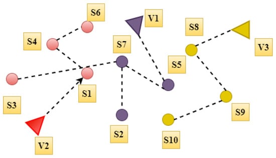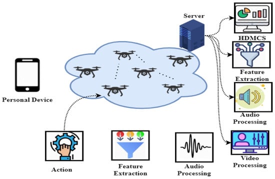 This paper considers a disaster management IoT platform with UAVs consisting of clusters with IoT units, UAVs, and network size . Ground IoT devices are assumed to be clustered by UAV coverage; cluster heads are selected by residual energy. Cluster heads will communicate information about their locations, and UAVs will share data collection capabilities. The UAV can then be ordered by the monitoring center to collect data from cluster heads and send them for analysis, as shown in Figure 5. This takes the data into account, and the monitoring center can ask the UAV for several tasks. It is believed that UAV L can carry out a number of tasks. is supposed to be the number of tasks attributed to UAV . The UAV can gather information for task from cluster heads to carry out this task in the form residual energy and area overage. This can be represented by the following (6):