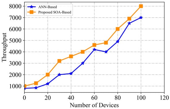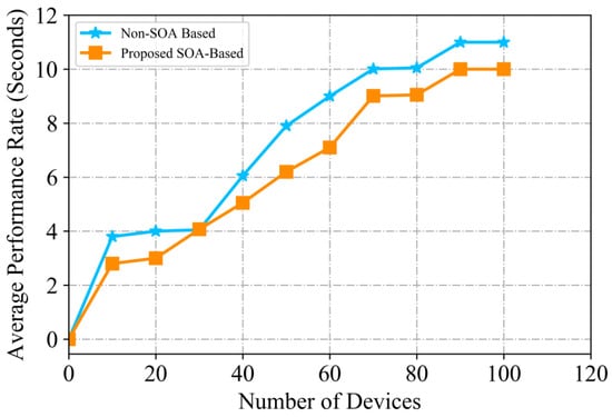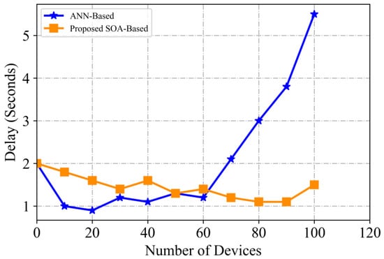 As shown in Figure 10, across all numbers of devices, the delay of the proposed work [31] is affected by the number of nodes. The delay increases with the number of devices from 2 s to 5.8 s. However, in our work the delay is mostly fixed, from 1.5 s to 2 s, due to the dynamic nature of proposed algorithm.