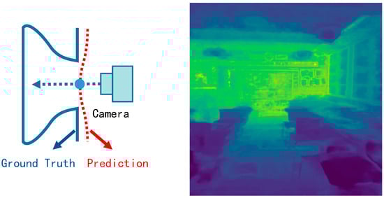 Although NeRF is able to synthesize photo-quality images with a complex geometry and appearance, NeRF still has many problems: first, the NeRF method requires a huge number of images, often hundreds of images for a “classroom” size scene. As shown in Figure 1, NeRF does not work well for scenes with only a few dozens of images, and the rendering results have large blurring areas. This is because NeRF relies purely on RGB values to determine the correspondence between images, and only a sufficient number of images can overcome this blurring generation to achieve high-quality visual effect. In the case of significantly reduced images, an NeRF technique that relies on color supervision alone is no longer able to construct fine 3D scenes. Secondly, the surface of the 3D model obtained using NeRF with a small number of inputs is rough. Because NeRF does not intersect rays with the surface of an object at a single point, but rather represents the probability of a series of points, the rendering process of the model relies on the RGB values of the image. Therefore, when only a small number of input images are available, the difference between the rendered image and the training image view is too large to enable the NeRF method to locate the exact intersection of the camera rays with the scene geometry and to show a blurred rendering (Figure 2). Thirdly, the NeRF method requires nearly 200 forward predictions of the MLP depth model for each pixel while producing raw images. Despite the small size of a single computation, the pixel-by-pixel computation to complete the rendering of the whole image requires a significant computational cost. Secondly, the training time required by NeRF for each scene is also slow due to the large number of sampling points required for each pixel point to determine its spatial location.