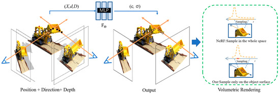 A joint optimization was performed for all parameters of both MLPs. A mean square error (MSE) color loss was applied for each ray r: , where is the ground truth color. Finally, the following equation is obtained: