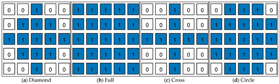 Here, is the output dense depth map of the same size as and , and the null is replaced with the depth estimate. We achieve this by processing the operation with different sized kernels as shown in Figure 5. For a depth image as shown in Figure 6a, the first step uses the Diamond kernel to complete the missing information next to the effective depth. The second step uses the 5 × 5 Full kernel to perform the closure operation for connecting the nearby depth values. The third step uses a 7 × 7 Full kernel to handle small to medium-sized voids. The fourth step uses a 31 × 31 Full kernel to handle the remaining larger voids, keeping the original effective pixels unchanged. The fifth step uses a 5 × 5 Cross kernel to remove the outliers presenting in the expansion process. Finally, a 5 × 5 Gaussian blur is used for smoothing. The result of the complemented depth is obtained, as shown in Figure 6b.