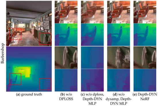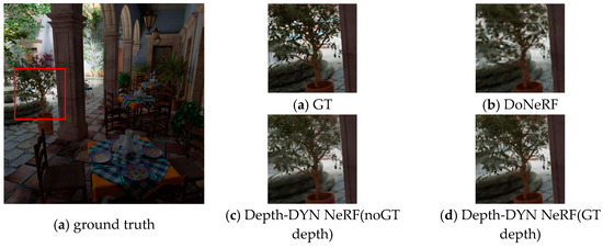 As shown in Figure 8b, because NeRF does not add depth supervision, it is difficult to rely on RGB values to determine the corresponding relationship between images in a small number of images, resulting in a large number of “artifacts”. MVSNeRF is used to learn a general network and reconstruct the radiation field across scenes from only three input images. However, due to the limited input and high diversity between different scenarios and datasets, it is impossible to achieve good results when the test scenario is too different from the pretraining scenario (example c in Figure 8). DoNeRF, on the other hand, introduces real depth information and considers only the important samples around the object surface; moreover, the number of samples required for each view ray can be greatly reduced. However, its network does not include depth information in the rendering stage, and the view differences under a small number of images are too large, resulting in the depth not being close to the true depth under the new view, which makes the image produce artifacts. Due to our depth supervision, we considered only the samples around the object and synthesized the depth information of the new view based on the depth information during the rendering phase, allowing the rays to be rendered around the samples. As shown in Figure 8, when using Barbershop, Depth-DYN NeRF greatly reduces these artifacts compared to the baseline, with more accurate depth output and more detailed colors. Depth-DYN NeRF also improved the quality of the rendering of the detail part (Figure 8 San Miguel), where no other method could recover the detail information of the vase, and where Depth-DYN NeRF was able to clearly recover complex textures.