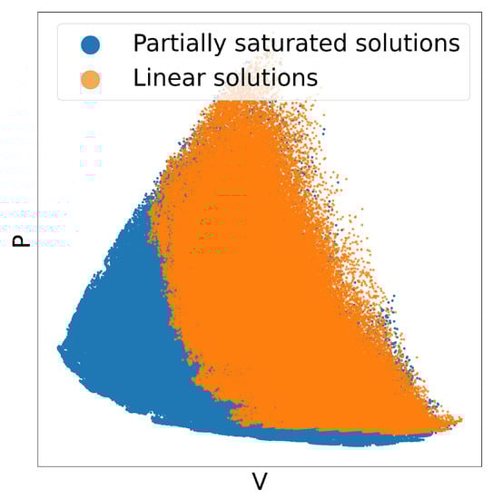 - The clouds of points in Figure 4 represent all the design configurations explored during a complete run of the optimisation procedure on the test problem, in the objectives space (volume V and total losses P, on the x and y axes, respectively). The colour depends on the feasibility of the configurations and distinguishes those configurations compliant with the design constraints (i.e., good, orange points) from those that are unfeasible (i.e., bad, blue points). Two graphs are reported to further distinguish between parent configurations (Figure 4a) and clones (Figure 4b). It can be noticed that only a small percentage of the configurations generated randomly (parents) is feasible. Clones, instead, have higher chances of complying with the design constraints since they originate from local mutations of feasible configurations.