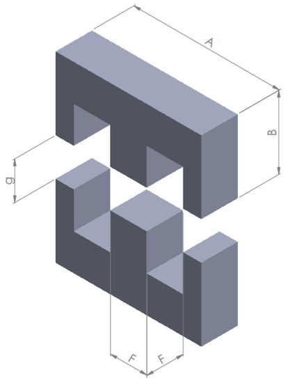Three-dimensional representation of the double-E core geometry. The design variables are: the width of the E core A, the height of a single E-core B, the extension of the central column F, and the air gap’s length g.