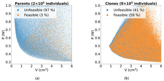 Figure 4. Representation in the objectives space (total losses and core volume) of all the design configurations explored during a run of the VIS multi-objective optimisation algorithm. The orange dots represent the feasible configurations (good), while the blue dots are the unfeasible ones (bad): (a) generated randomly (parents); (b) generated by local mutations of the parents (clones). The total number of parents and clones evaluated and the percentages of good/bad ones are shown.