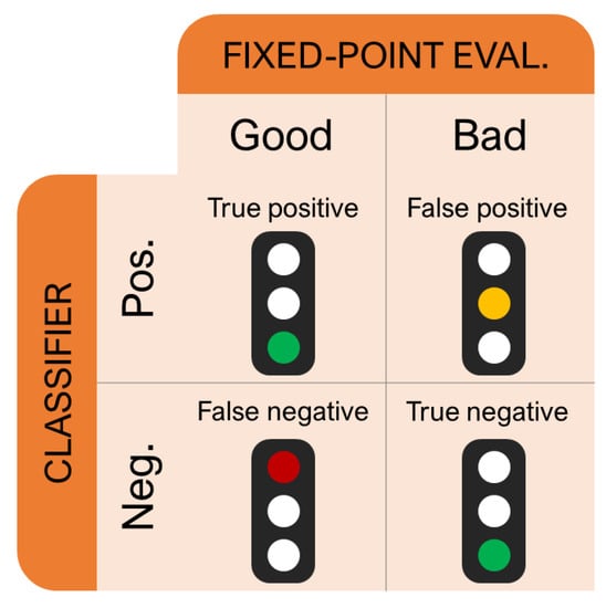Confusion matrix of the responses given by the classifier system and the evaluation with the FP iterative technique. The traffic lights highlight the effect of the response on the optimisation process: green stands for a correct classification, yellow for an incorrect evaluation that should not affect the output of the optimisation, and red for an incorrect classification which could negatively affect the final result.