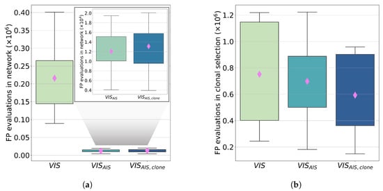 Figure 7. Box plots of the FP executions in the 30 runs of the three tested approaches. The pink diamonds represent the mean value of each case: (a) describes the FP evaluations for the randomly generated cells. A zoom of the results for the two classifier approach is reported in the upper right corner; (b) describes the FP evaluations for the locally mutated cells.