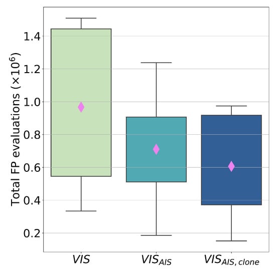 Box plot of the total FP executions in the 30 runs of the three tested approaches. The pink diamonds represent the mean value of each case.
