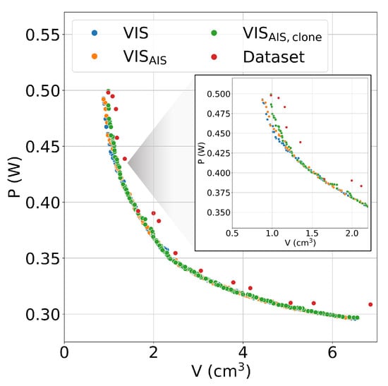 As previously mentioned, about 50% of the configurations generated in the VIS optimisation are unfeasible, and thus a perfect classifier allows for avoiding, on average, 500,000 FP calls. The results show that the tested classifier avoids 260,000 calls when applied only on randomly generated solutions and avoids 360,000 calls when applied both on parents and clones. These results are quite satisfactory but can still be improved by adopting a more effective classification system in the region of the locally mutated cells. Other considerations can be studied by observing the Pareto Fronts obtained through the three proposed approaches, reported in Figure 9.