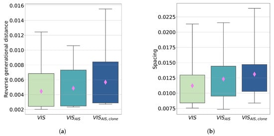 (a) Box plots of the reverse generational distance index for the 30 runs of the three tested approaches. The pink diamonds represent the mean value of each case; (b) Box plot of the spacing index for the 30 runs of the three tested approaches. The pink diamonds represent the mean value of each case.