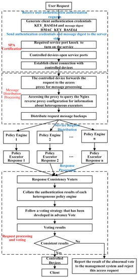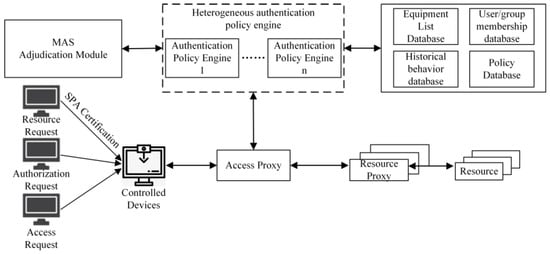 The workflow of the MAS implementation is shown in Figure 5. When a user submits a resource request, the controlled device first uses single-package authorization to verify the user’s device identity and then sends the request to the access proxy after passing the verification. The access proxy serves as a reverse proxy server and forwards the user request to the service queue of the heterogeneous policy engine in the system. Each heterogeneous executor uses the identity authentication method formulated in advance to authenticate the user and returns the result to the consistency adjudicator for judgment and allocates the resources requested by the user after passing the verdict.