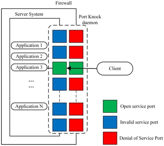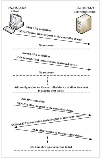 The MAS uses Single Packet Authorization to access the controlled devices under the zero-trust authentication system. According to the analysis of the attacker’s behavior in Section 3, when an attacker uses a trusted device inside the system as a jump server, frequently sending resource requests to the policy engine, it will affect the real-time bandwidth and connectivity of the system, which is often referred to as a DDOS attack. The problem of first packet trust is to consider how to allow only trusted connections and discard all other connections without responding to any unauthenticated data packet, which is usually solved by preauthentication. As shown in Figure 2, the port knockdown daemon is used for the real-time management of open ports, and port knockdown is required for service requests before each user makes a service request. SPA is a lightweight security protocol [] that verifies the identity of a device or user before allowing access to the network on which the relevant system components such as controllers or gateways reside. Under the SPA protocol, various applications and network services are hidden behind the system firewall. The firewall defaults to discard all incoming unauthenticated TCP and UDP packets and does not respond to unconfirmed connection attempts. For potential attackers inside and outside the system, they can only access the requested service application after the first packet authorization verification because they cannot know which ports of the system service are open or listened to.