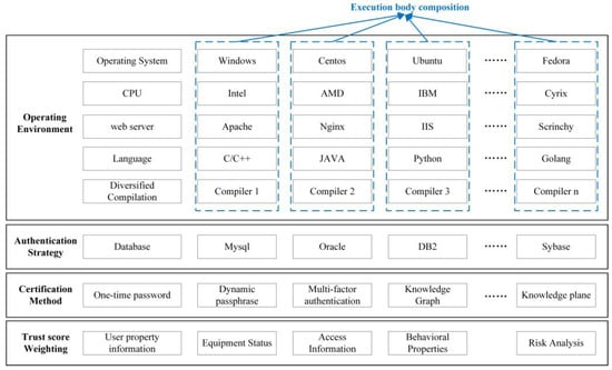 In the process of designing the heterogeneous authentication policy engine, by choosing different operating systems such as Windows, Centos, Ubuntu, etc., the system service software runs different web server software such as Apache(Apache version 2.4, Brian Behlendorf: Urbana Champagne, US)), Nginx(Nginx version 1.12.2, Igor Sysoev: Russia), IIS(IIS version 10.0, Microsoft: Redmond, US)), etc., and uses different compiled/interpreted languages such as C/C++, JAVA, Python and Golang to implement different writing methods to execute programs with the same function; then, it selects different compilers and diverse compilation methods to perform heterogeneous processing from the aspect of the operating environment, increasing the difficulty of performing a system analysis on the heterogeneous policy engine while disrupting the malicious attacker from detecting the system information which, in the attacker’s view, is in a state of dynamic change. Since different software and hardware are used to build the authentication policy engine, the possibility of attackers using common vulnerabilities to carry out coordinated attacks is greatly reduced, and the backdoor problem of unknown vulnerabilities that may exist in the system design process is solved.