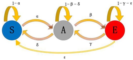 the attacked state and finally to the system failure state . Figure 6 depicts the modeling of security threats as Markov models with state transfer probabilities. The attacker attacks the authentication system to make it transition from the protected state to the attacked state with a probability , while the state may return to the state by the instantaneous probability of the protective measures or further transition to the failure state with instantaneous probability . In order to facilitate the analysis, this process is described by the mimic defense Markov game model, which can define a quintuple suitable for the game analysis of the MAS.