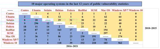 In this paper, the number of public vulnerabilities of 10 mainstream operating systems in the past 12 years is counted from the CVE (Common Vulnerabilities and Exposures) of each system’s vulnerability records. From the comparison of the data in Figure 7, one can see that for the Linux system kernel release version, the Debian system and Redhat system were largely different from the Linux system version, whereby the number of common vulnerabilities was less. It can be seen that for homogeneous/homologous systems, the likelihood of common vulnerabilities was higher, and the risk of being attacked by malicious attackers was greater. For heterogeneous operating systems, the number of public vulnerabilities was relatively low due to different system CPU scheduling management, different memory-based space allocation management procedures and different device drivers, which can effectively avoid malicious attacks caused by common vulnerability attacks.