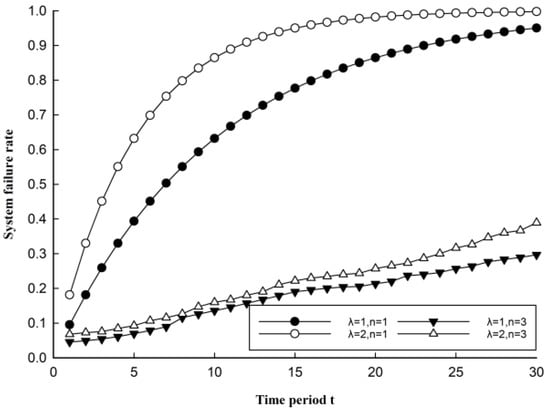 The failure rate of the system in the case of a single executor obeys the exponential distribution of the failure rate . With the progress of the attacker’s attack process and the in-depth understanding of the system information, the probability of a successful attack leading to system failure gradually converges to one. indicates the attacker’s attack strength, and when the attacker launches a targeted attack with a strong attack capability, the value of is larger and the system failure rate is higher. The system failure rate can be expressed as: