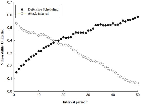 In the MAS, the time interval for the attacker to take attack measures and the time for the defender to schedule defense measures have a decisive impact in the system utilization. Based on this, experiments were conducted to change the interval period between the implementation of the attack/defense measures from. The results showed that (Figure 16) as the interval period of the measures taken by both the attacker and the defender increased, the defender took measures at a longer interval, resulting in system vulnerabilities not being discovered and patched in time, and the utilization rate of the system vulnerabilities increased; due to the increase in the interval period of the attackers, the utilization rate of the system vulnerabilities was reduced.