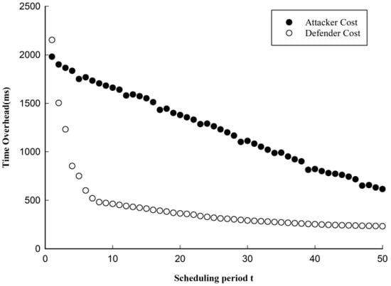 As the system scheduling cycle (i.e., the system defense policy update cycle) increases, the attacker overhead decreases, the cost of attacking the system decreases and the cost of defender measures to maintain the system decreases. The experimental results are shown in Figure 17.