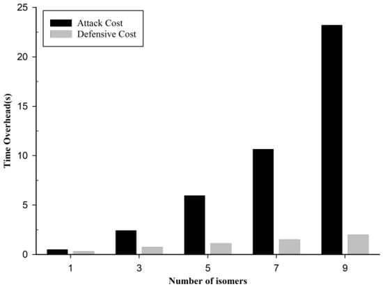 The experiments of the attack overhead and defense overhead were run in the proposed system in this paper with the number of heterogeneous bodies as one (nonheterogeneous system), three, five, seven and nine. It is obvious from Figure 18 that when the number of heterogeneous bodies running in the system increases, both the attack overhead and defense overhead tend to increase, but the challenge to the attacker is greater, so the significance of transforming the system into heterogeneous and mimic is obvious.