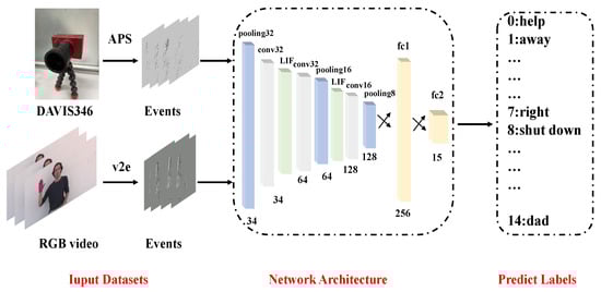 Due to the lack of sign language datasets based on event cameras, we chose the v2e method to convert traditional RGB video sign language videos into event stream data.We used the LSA64 dataset, which contains 64 commonly used words in daily life. Verbs and nouns are included. We chose some common sign language gestures for the proposed dataset considering human–machine interaction. Additionally, to better validate our training method, we created the DVS_Sign dataset, the event-based sign language dataset, using event cameras. We used the event camera DAVIS346, which can output event stream and intensity information at the same time using the event camera to collect the same sign language video as the LSA64 dataset, and package each sign language video in the same folder. Since the collected sign language dataset is in aedat format, we converted aedat into the csv data format required by the network. This ensured a more accurate comparison of the impact of datasets on training accuracy. We provided a video-to-event method to obtain data from different existing sign language datasets from RGB video, as a technical solution to sign language dataset conversion.
