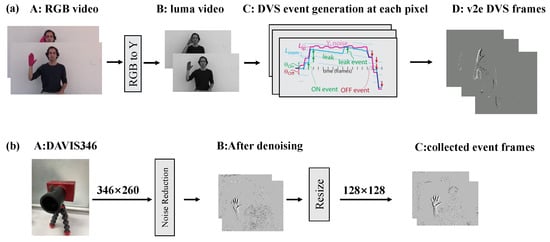 Steps A–B in Figure 4a represent the color-to-brightness conversion. A color RGB video is transformed into M luminance frames, where each frame is associated with a timestamp. Then, synthetic slow motion is introduced: the luma frames are optionally interpolated using the Super-SloMo video inter-polation network [] to increase the temporal resolution of the input video. Super-SloMo predicts the bi-directional optical flow vectors from successive luminance frames. This is used to linearly interpolate new frames at arbitrary positions between the two input frames. The next step is a linear to logarithmic mapping []: a standard digital video usually represents intensity linearly, but DVS pixels detect changes in logarithmic intensity. Step C represents the event generation model; we assume that the pixel has a memorized brightness value and the new low-pass filtered brightness value. The model was used to generate a signed integer quantity to represent positive ON or negative OFF events from the change of memorized brightness value minus filtered brightness value, and the luminance value stored in multiple DVS events is updated to a signed integer multiple of the threshold. (b) means that we use DAVIS346 to collect sign language datasets, and the size of the collected video is 346 × 260. Secondly, we denoised the event stream data, cleaned up unnecessary event coordinates, and then cropped the video size to 128 × 128, so as to enter the network training, and finally the event frame dataset of our sign language dataset was obtained.