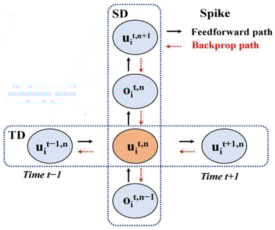 At the single neuron level, Figure 5, the propagation is decomposed into a vertical path for SD and a horizontal path for TD, each neuron accumulates a weighted error signal from the upper layer and iteratively updates parameters in different layers. In TD, the neuron state is iteratively expanded in the temporal direction that enables chain rule propagation. At this point, we clearly understand that the complete gradient descent process is obtained during the training process. On one hand, each neuron accumulates weighted error signals from the upper layers in SD, on the other hand, each neuron also expands the state space iteratively based on the chain rule from the received propagated errors in self-feedback dynamics.