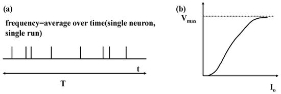 The encoding time window T is experimentally based on actual data and depends on the type of neuron and the form of stimulation. In our experiments, this is 40 ms or 60 ms. According to the results of our experiments, T is determined by the number of the event in the time interval. If the time interval T is too large or too small, it is not conducive to the accumulation of spikes and an appropriate time window T is selected according to different experimental data and event data. The frequency encoding process based on spiking counting is shown in the figure below. Figure 6a describes that the frequency v of a neuron is the average of the number of spikings released at a given time T. Figure 6b shows the output frequency v as a function of the total input current in the gain function. As the stimulus intensity increases, the neuron spiking firing frequency v gradually increases, and for a larger input current , the firing frequency gradually approaches the maximum value .