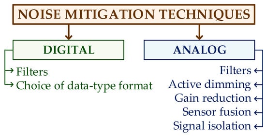 Various techniques can be used to remove or mitigate noise in an input signal, depending on the type of noise, its measured level, and the application. In general, these techniques can be classified into analog and digital, depending on the type of signals on which they act (Figure 1).